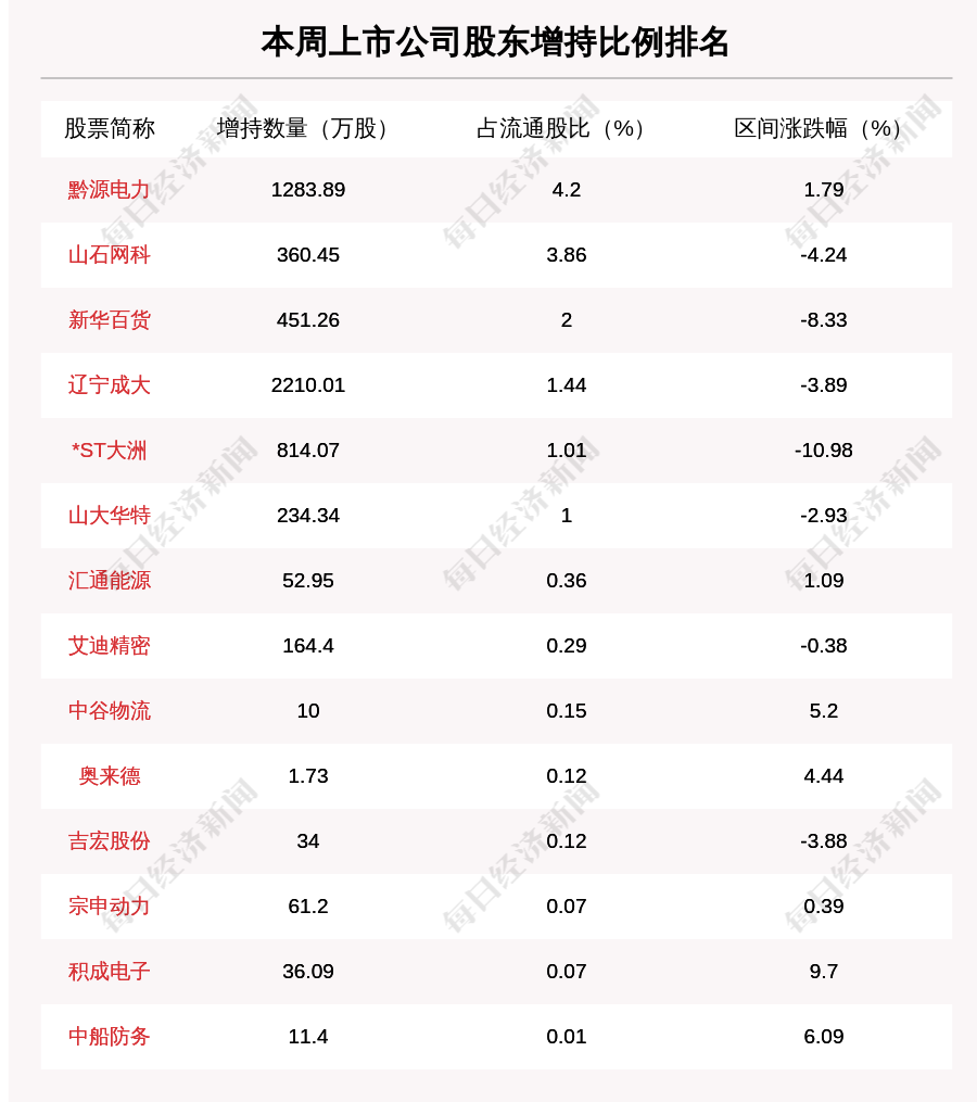 从增持力度上来看,本周获股东增持比例(占流通股比)前三的公司是黔源电力、山石网科、新华百货,增持比例分别为4.2%、3.86%、2%。