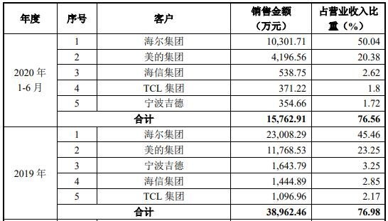 对于上述问题,宏昌电器在招股书(注册稿)中解释称,客户较为集中主要系受下游行业市场集中影响,海尔集团、美的集团等下游家电龙头企业在洗衣机等家电领域占据了绝对市场份额。