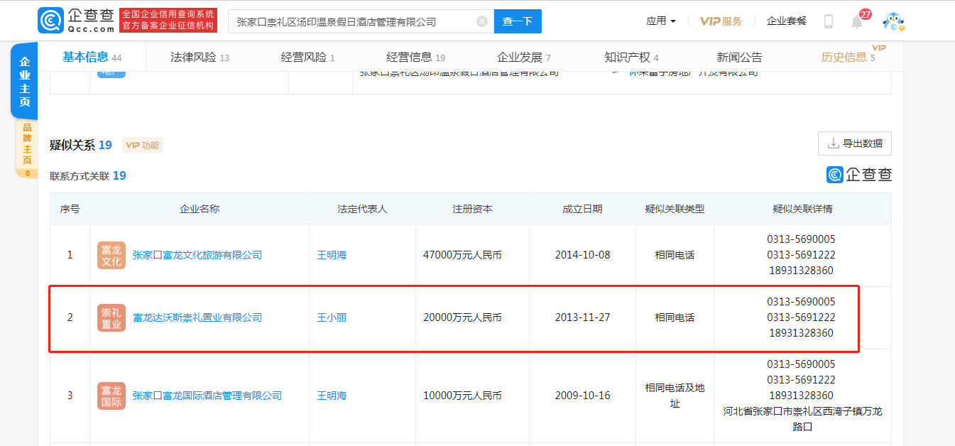 富龙达沃斯崇礼置业有限公司与张家口崇礼区汤印温泉假日酒店管理有限公司在工商信息登记中预留的电话号码相同。